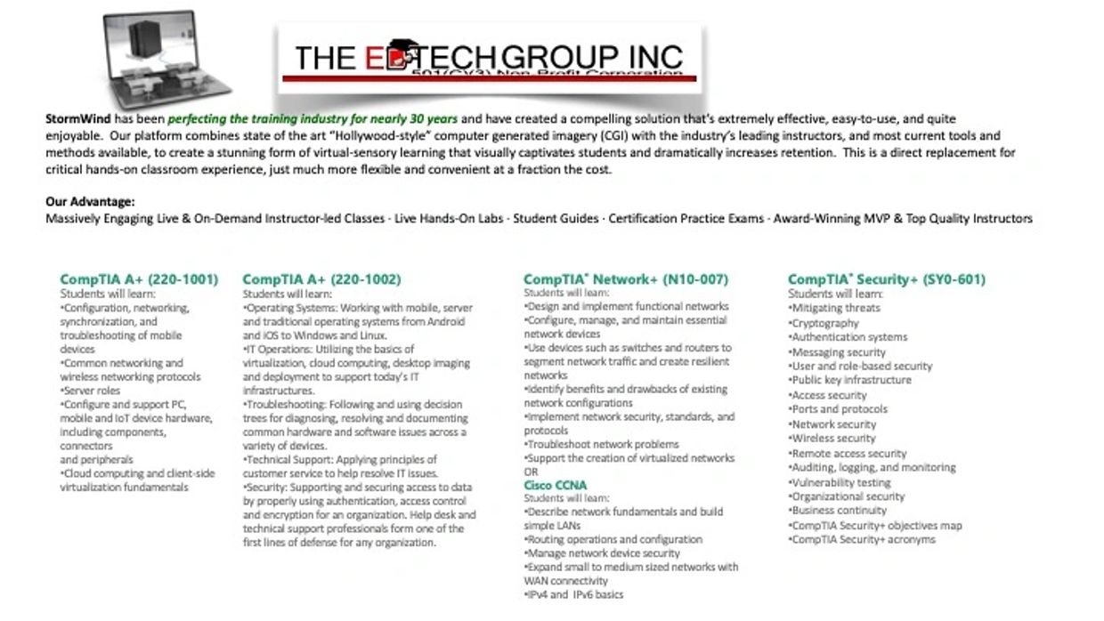 The ED-TECH Group, Inc. provides a secure e-learning environment, with web based certified CompTIA instructors, classroom instructors, 24/7 Mentors, Academic Mentors, Web-Housed Accountability that provides statistics on student success 24/7 available for students and stakeholders to see any time of day or night. Students can review each class segment at home on a smartphone, computer, or any other handheld PDA.